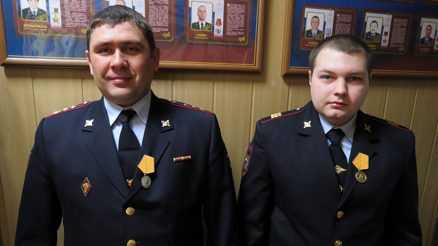 Сотрудники отдельной роты патрульно-постовой службы полиции ОМВД России по городскому округу Ступино капитан полиции Владимир Жиляков и сержант полиции Андрей Былба награждены медалями МВД России «За смелость во имя спасения» за проявленные смелость и самоотверженность при спасении людей. Ведомственные награды им вручил начальник ОМВД России по городскому округу Ступино полковник полиции Андрей Желудков.