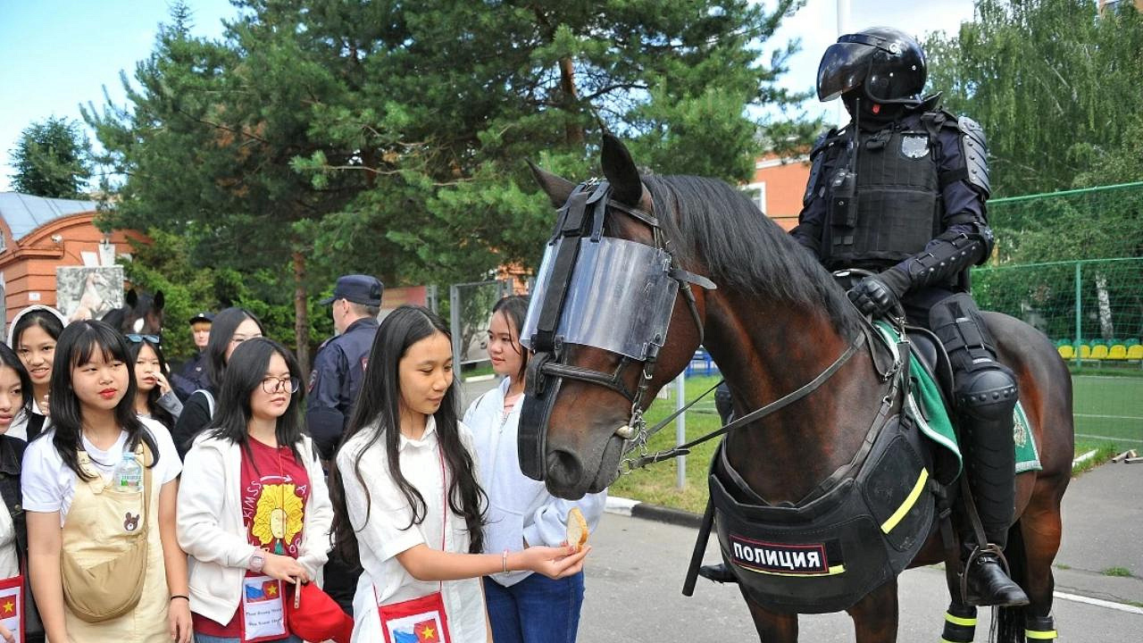 1 июля столичные полицейские пригласили зарубежных гостей в Первый Специальный полк полиции ГУ МВД России по г. Москве. Детей познакомили с работой подразделения, прокатили желающих на конной повозке и показали, как мастер кузнечного дела подковывает лошадей. Также гости увидели защитную экипировку служебных животных, специальное снаряжение и амуницию, которые вызвали у них неподдельный интерес.