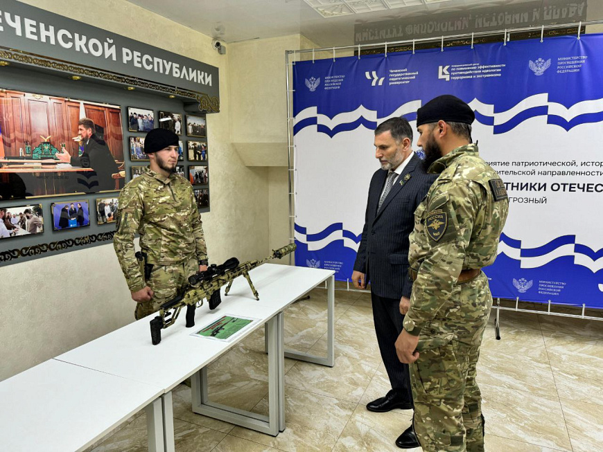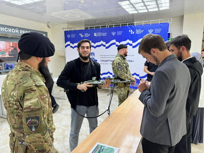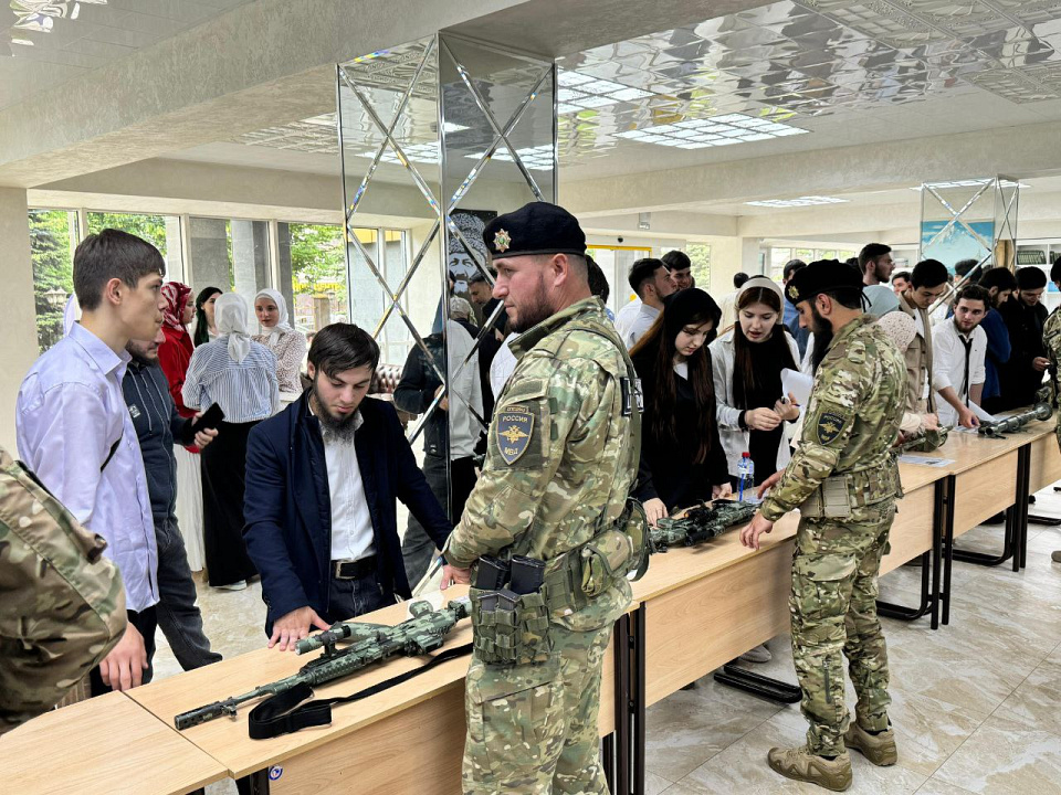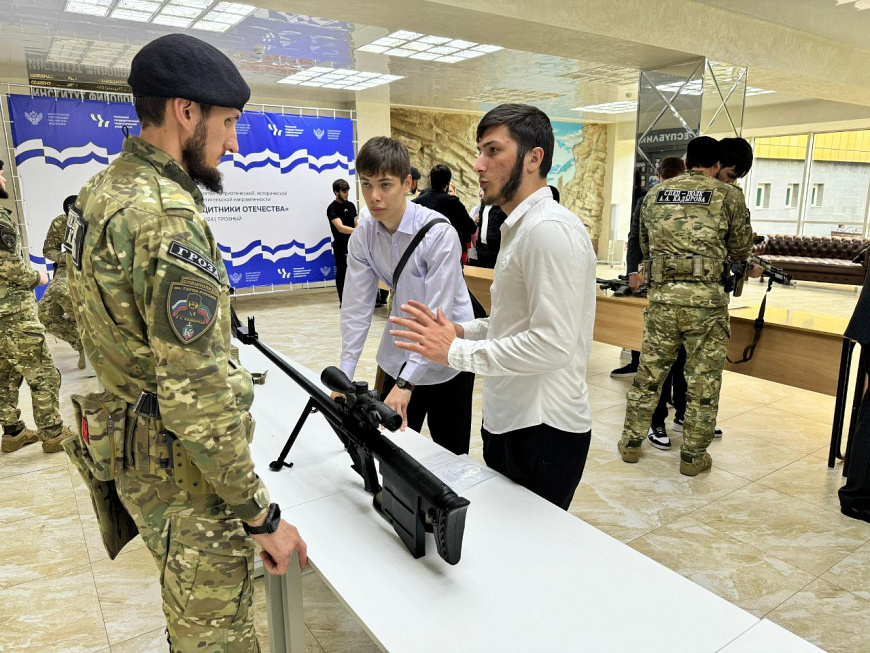 В рамках акции «Защитники Отечества» сотрудники специального полка полиции им. Героя России А.А. Кадырова МВД по Чеченской Республике организовали для студентов Чеченского Государственного педагогического университета выставку находящегося у них на вооружении оружия и спецсредств.