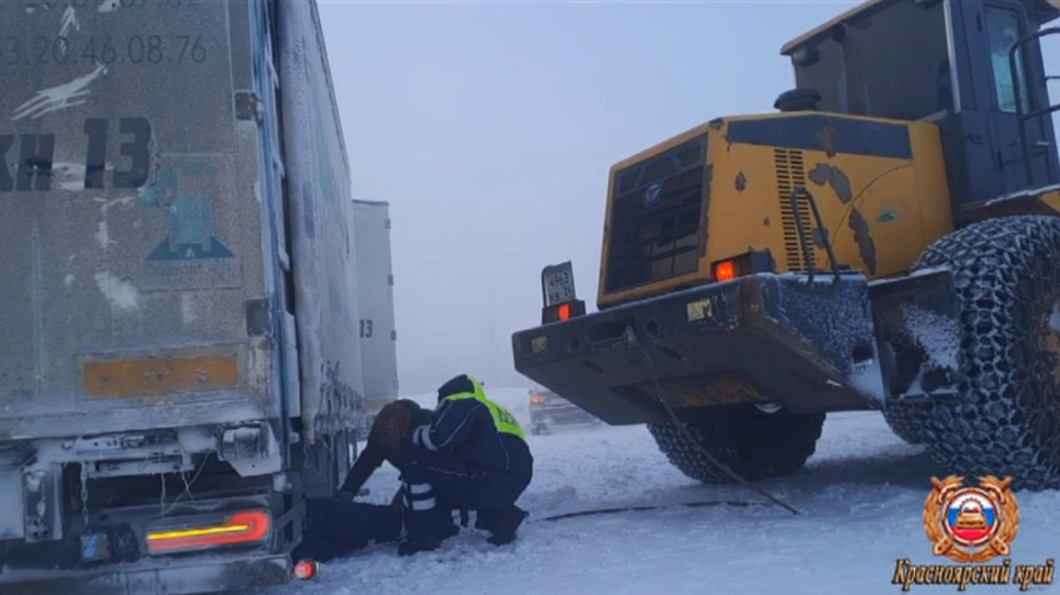 Сотрудники полиции связались с работниками местного завода, которые, задействовав погрузчик, помогли вытащить большегрузную машину из снежного плена.