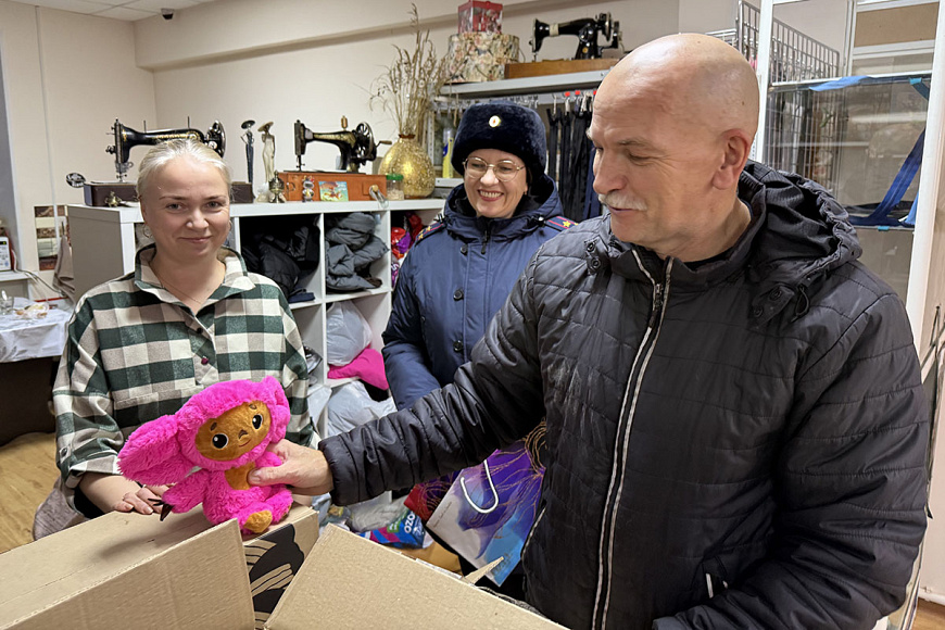Председатель Общественного совета при УМВД Роман Корсун поблагодарил организаторов за возможность поучаствовать в акции и от себя лично передал бойцам на передовую один из неофициальных символов специальной военной операции – Чебурашку.