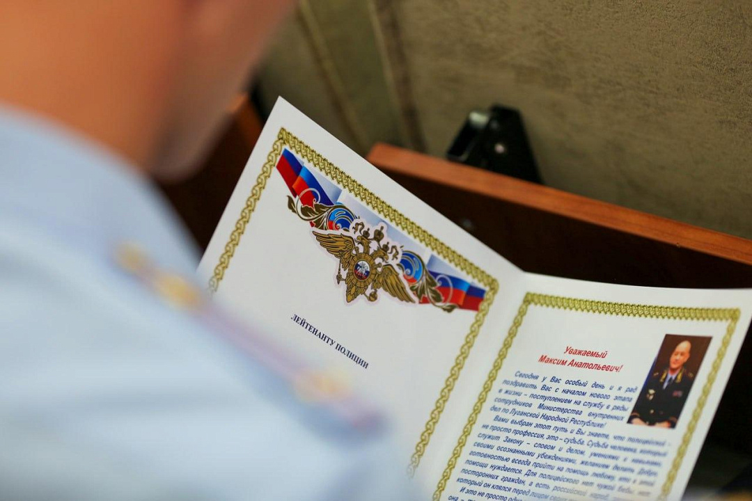 В здании Министерства внутренних дел по Луганской Народной Республике состоялась торжественная церемония вручения служебных удостоверений молодым сотрудникам, пополнившим ряды правоохранителей субъекта. 120 юношам и девушкам, в этом году окончившим Луганский филиал Воронежского института МВД России, документы и поздравительные адреса вручили Министр внутренних дел по Луганской Народной Республике генерал-лейтенант полиции Алексей Кампф, заместители главы регионального МВД: начальник полиции генерал-майор полиции Сергей Чернозуб и генерал-майор внутренней службы Максим Невретдинов.