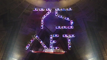 Возложив цветы к Вечному огню, полицейские выстроили патрульные автомобили в виде цифры «75», а затем включили фары и проблесковые маяки.