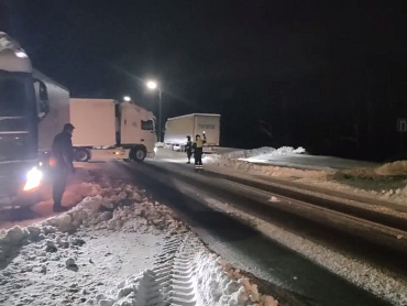 Полицейские привлекли встречные грузовые автомобили, которые тросом успешно вытащили фуры на проезжую часть. После этого дальнобойщики продолжили свой путь.