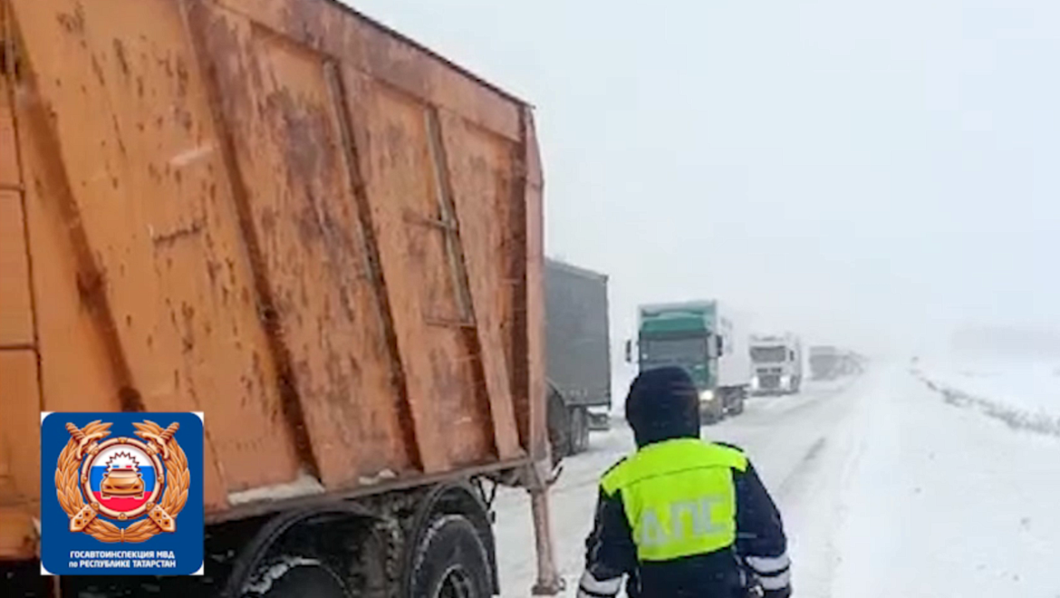 В Татарстане госавтоинспекторы оказали помощь водителю фуры, застрявшей в метель посреди дороги