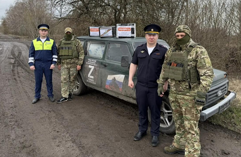 Колонна с автомобилем, снаряжением, продуктами питания и маскировочными сетями была доставлена в Курскую область при сопровождении экипажа ДПС окружной Госавтоинспекции.