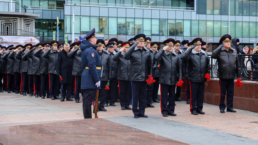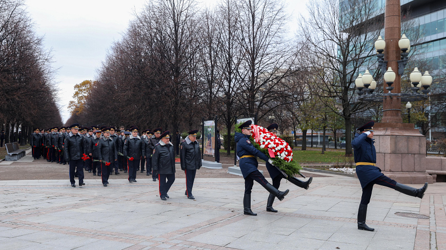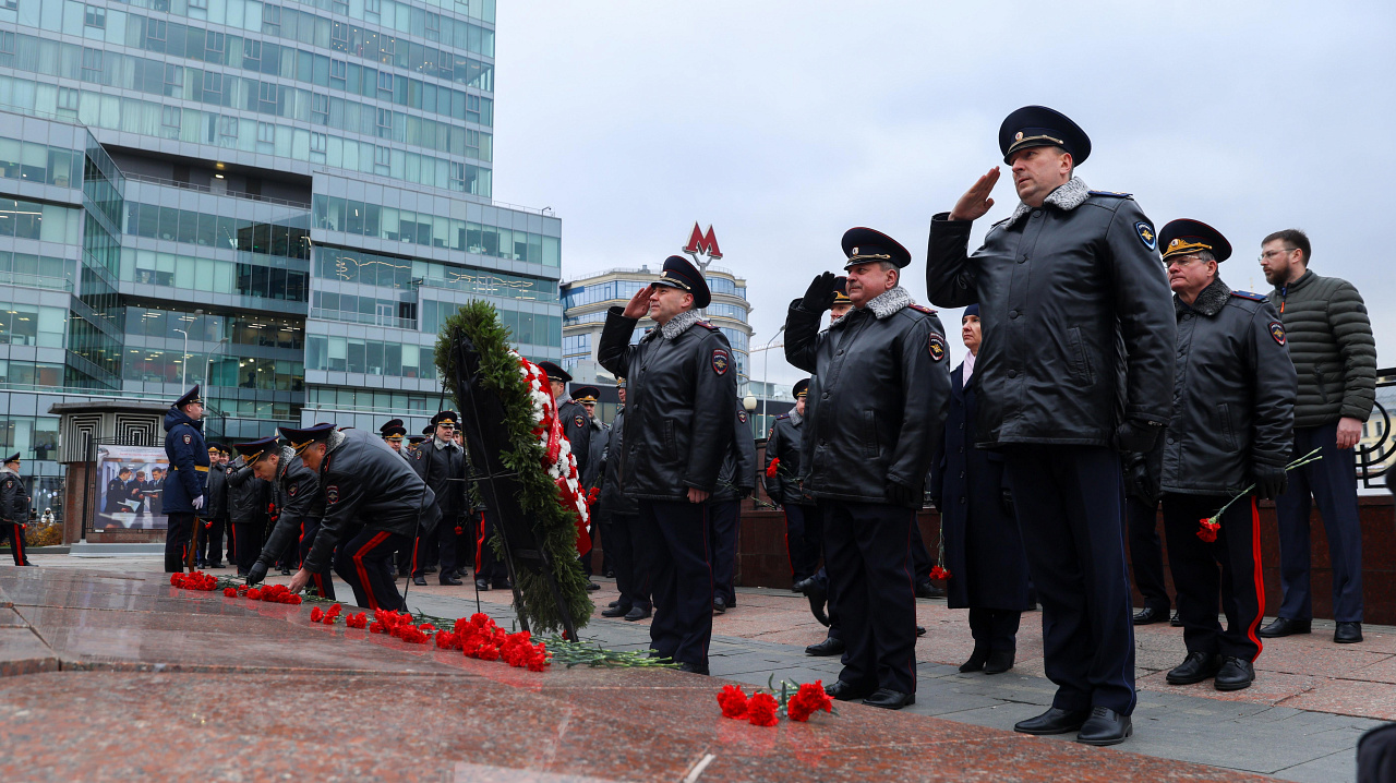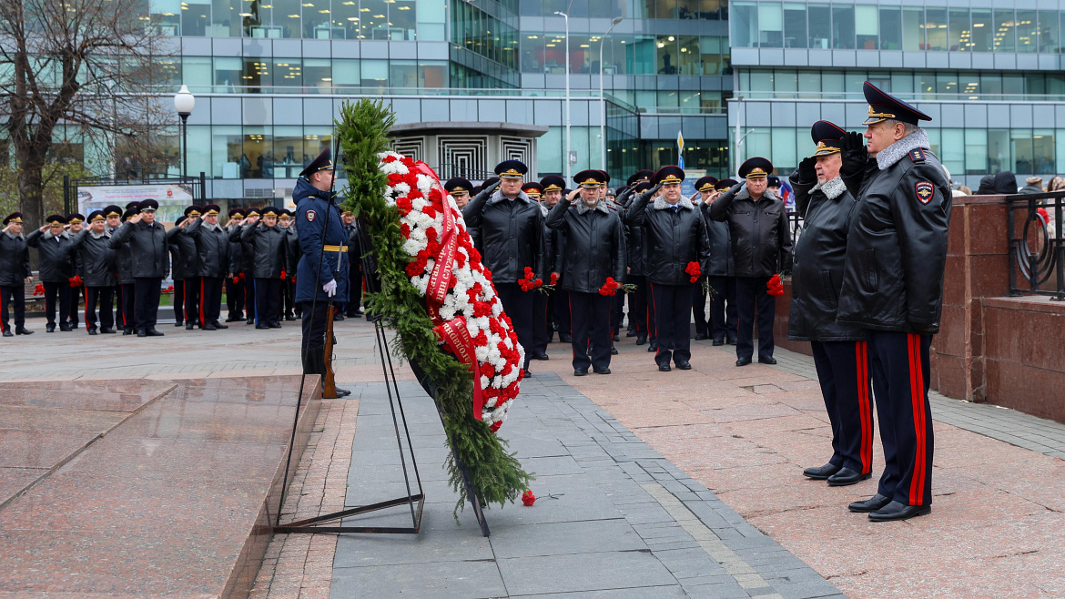 Делегация МВД России во главе с заместителем Министра внутренних дел Российской Федерации генерал-полковником полиции Владимиром Кубышко возложила венок и цветы к памятнику «Благодарная Россия – солдатам правопорядка, погибшим при исполнении служебного долга» на Трубной площади Москвы.