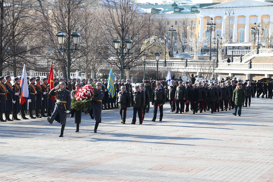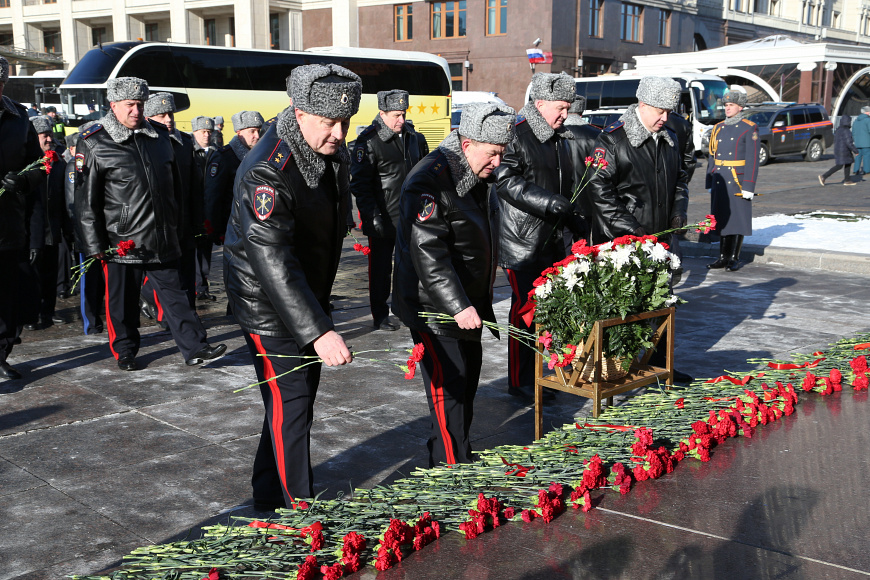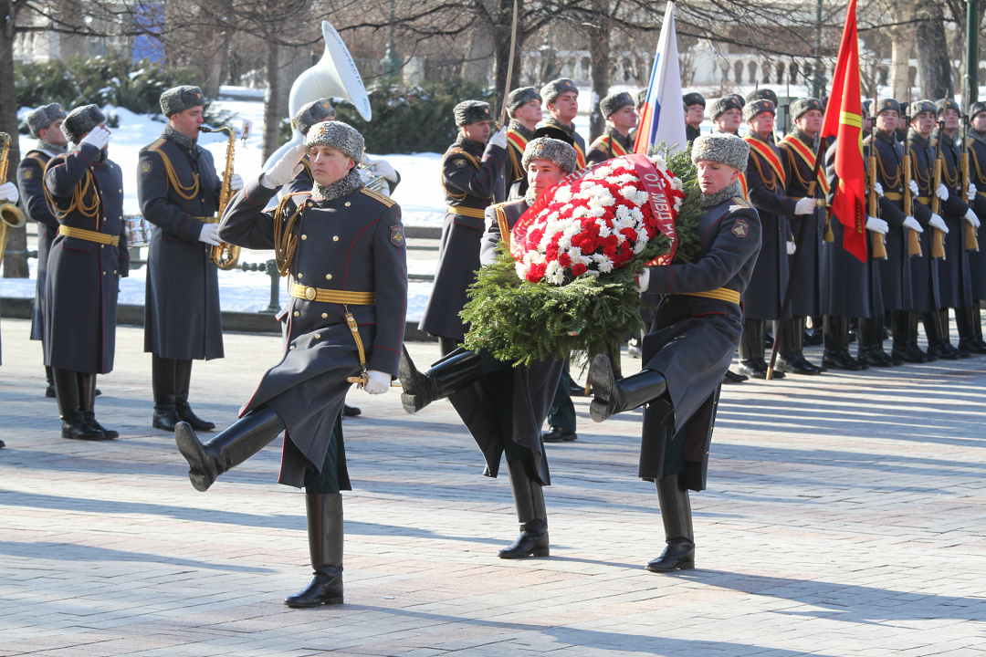 В Москве в День защитника Отечества прошла церемония возложения венка и цветов к могиле Неизвестного Солдата у Кремлевской стены, а также к памятнику маршалу Жукову и мемориалу «Благодарная Россия - солдатам правопорядка, погибшим при исполнении служебного долга».