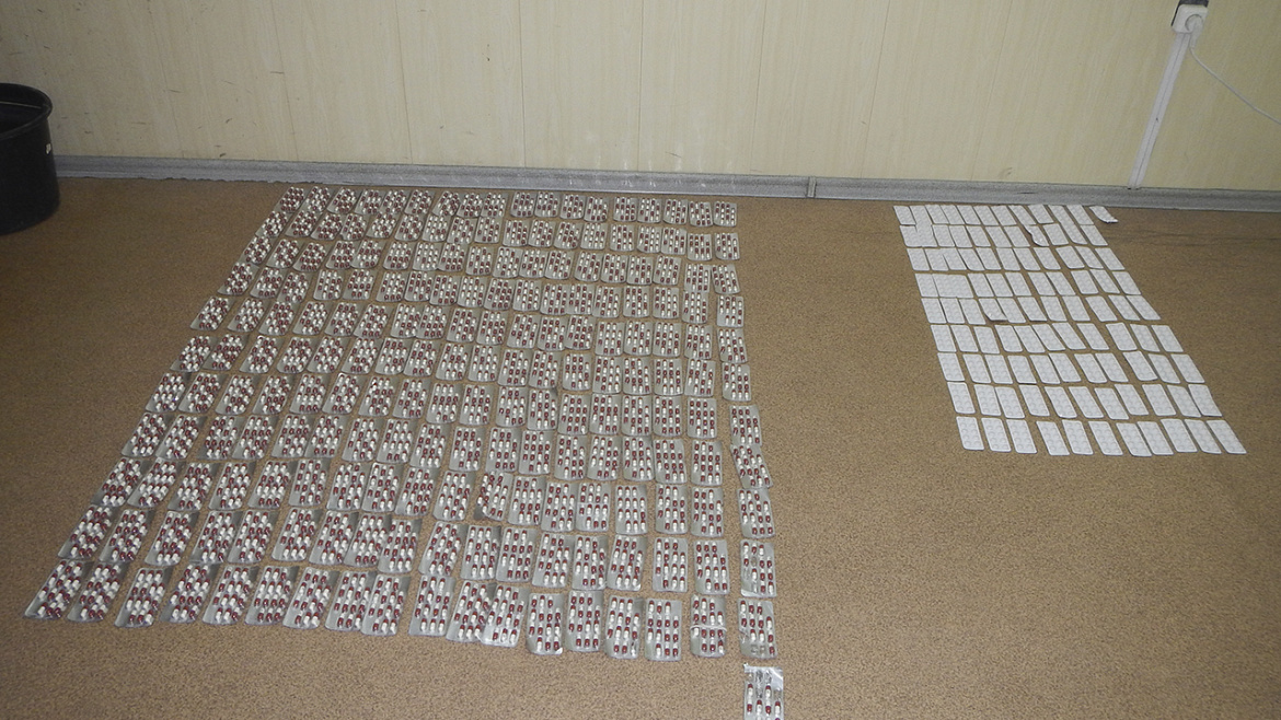 В ходе дальнейшей проверки в его личных вещах было обнаружено около 300 блистеров с таблетками и капсулами, а также 2 белых полимерных флакона с прозрачной жидкостью внутри.