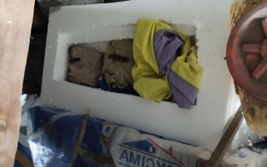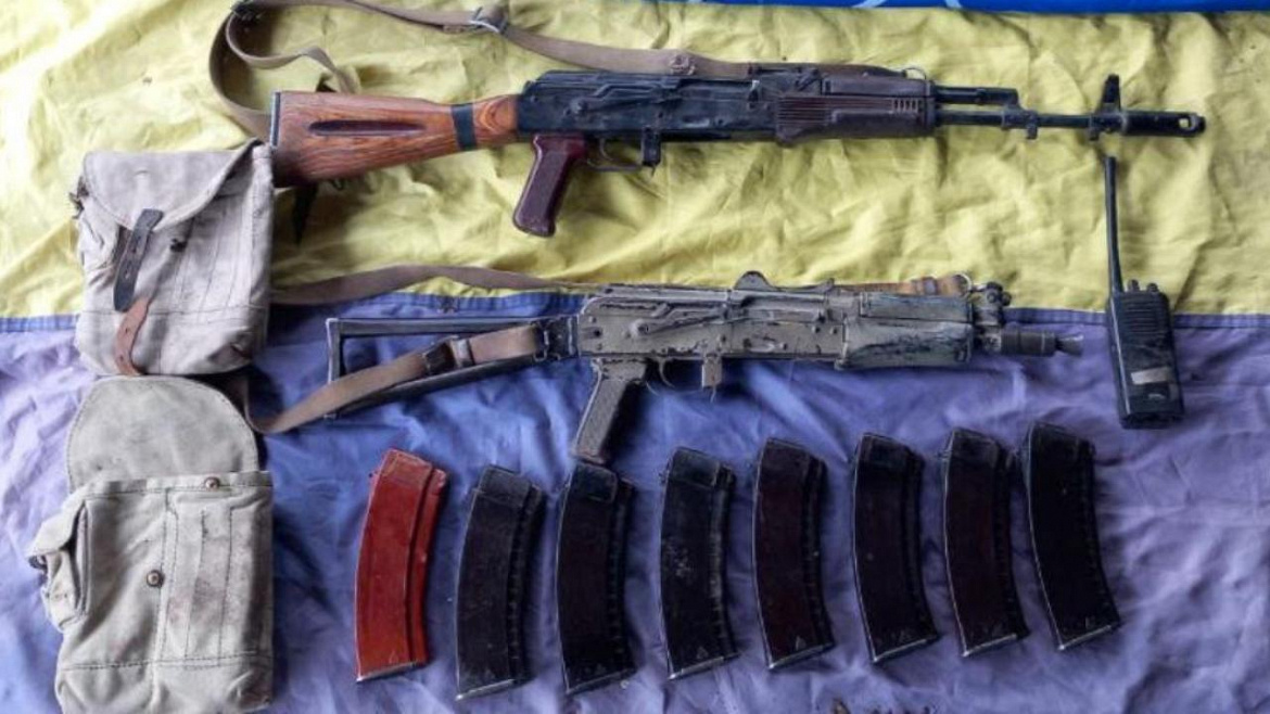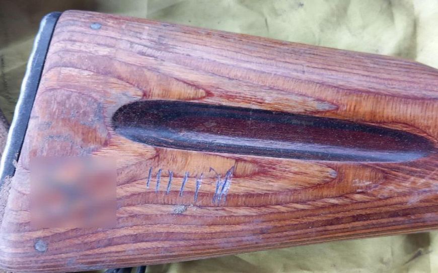 В ходе оперативно-розыскных мероприятий, проходивших в населённом пункте на линии соприкосновения, полицейские обнаружили и изъяли на чердаке дворовой постройки по месту проживания подозреваемого автомат АК-74 с символикой в виде свастики на прикладе, автомат АКСУ-74, 8 снаряжённых магазинов к ним с 240 патронами, 2 подсумка, радиостанцию и флаг Украины.