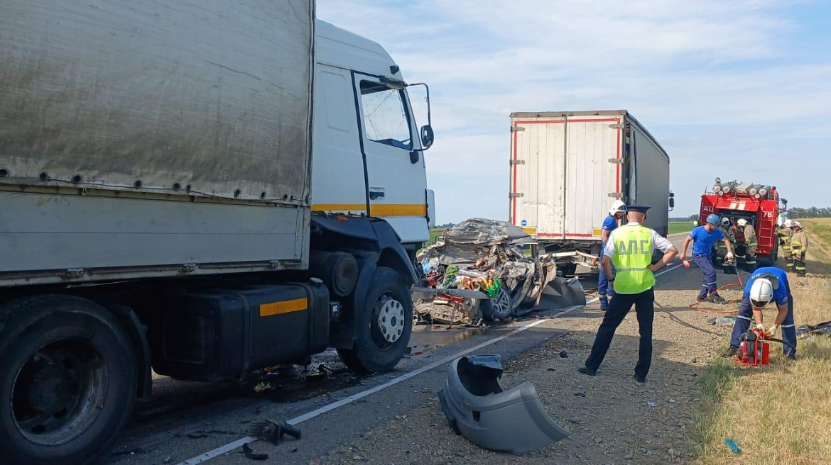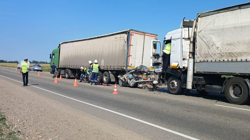 На Кубани полиция устанавливает обстоятельства ДТП, в котором машина оказалась зажатой между грузовиками