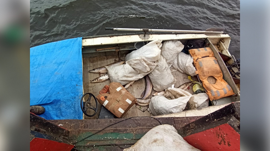 В трюме теплохода, предназначенном для моментальной заморозки выловленной рыбы, в сетях и моторных лодках браконьеров полицейские обнаружили более 400 особей рыбы, в том числе 207 экземпляров щук, 2 нельмы, 27 чиров, 88 сигов, 67 пелядей, 3 муксуна, 17 сорог и 4 окуня. Ущерб, причинённый государству, составил более 700 тысяч рублей.