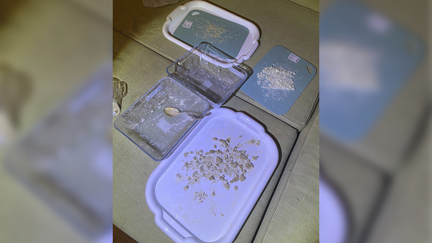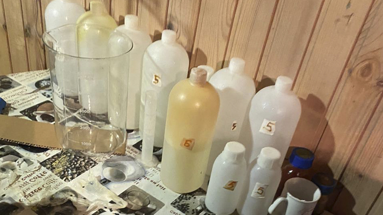 По месту жительства задержанного полицейские обнаружили и изъяли стеклянные и пластиковые колбы, бутылки и ёмкости с неизвестной жидкостью, полимерные пакетики с порошкообразным веществом, подносы и тарелки с сыпучим веществом, деревянный ящик с жестяными банками и пластиковую канистру с жидкостью темного цвета.