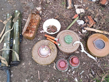 Под мебелью и деревянным покрытием пола обнаружены 501 патрон, 3 минных взрывателя и мина, 2 дымовые шашки, 2 сигнальные ракеты, 2 тубуса для гранатомётов, медаль и нагрудный знак ВС Украины.
