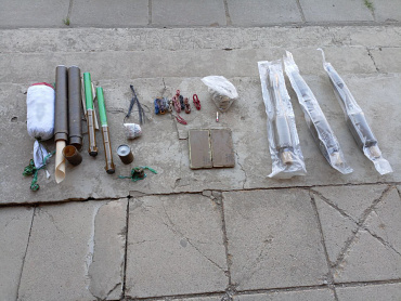 В тайнике было спрятано 4 пороховых заряда к противотанковому гранатомету 7ВР, выстрел для РПГ-7В, реактивный снаряд неустановленного образца, две мины 120 мм, а также форма с нашивками ВСУ.