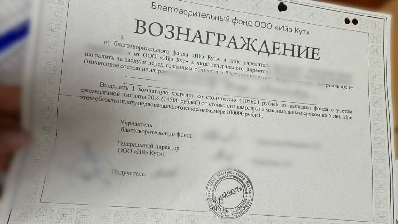 Имитируя активную общественную деятельность, обвиняемая поощряла постоянных клиентов грамотами и подарками, выдавала так называемые «добрые карты», обещавшие привилегии при выплатах дивидендов. Кроме того, она вручала им фиктивные сертификаты на предоставление квартир в строящемся 203‑м микрорайоне Якутска доме. За это она требовала около одного миллиона рублей в качестве разового членского взноса.