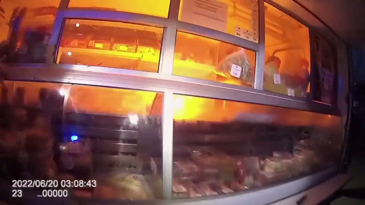Прибывшие на место происшествия сотрудники полиции осмотрели строение снаружи, а когда подняли ставню, то увидели, что стекло витрины разбито, а внутри находится молодой человек.