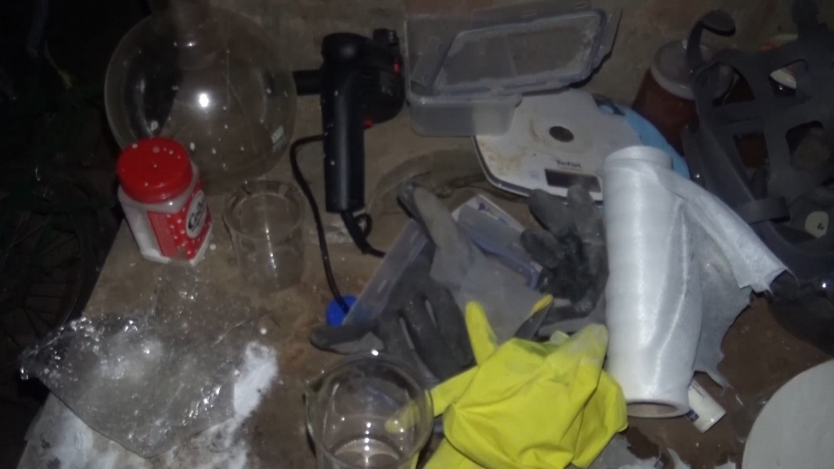 Во время осмотра подпольной лаборатории полицейские обнаружили более 400 грамм мефедрона, электронные весы и упаковочный материал.