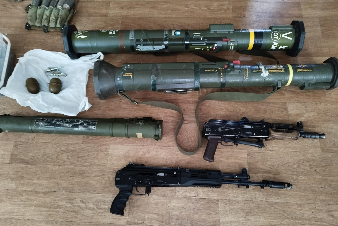 В результате полицейские обнаружили и изъяли три ручных гранатомёта, два из которых иностранного производства, две гранаты РГД-5, два автомата Калашникова, пять выстрелов к подствольному гранатомёту ГП-25 и 320 патронов калибра 5,45.