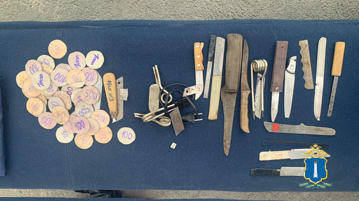 В ходе обысковых мероприятий на территории колонии были изъяты предметы, схожие с холодным оружием, игральные карты, игровые фишки, а также различная атрибутика экстремистской ячейки.