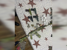 Кроме того, в помещении полицейские обнаружили и изъяли предмет, внешне схожий с автоматом, два пистолета, а также два магазина к автомату, 8 магазинов к пистолету, 16 коробок с патронами от пистолета Макарова.