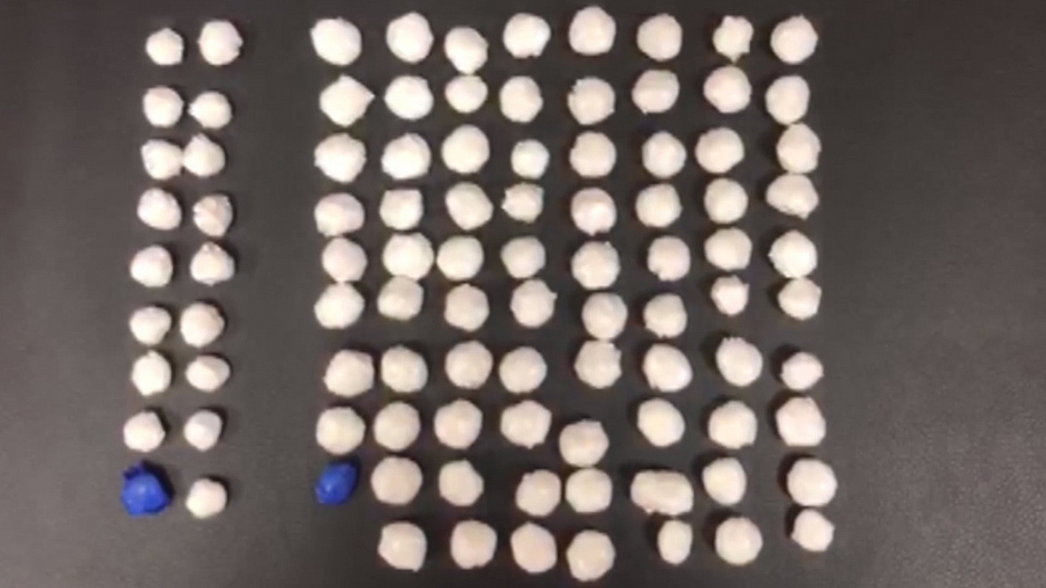 Во время личного досмотра в кармане куртки злоумышленника и в рюкзаке полицейскими обнаружены и изъяты 97 свёртков с порошкообразным веществом светлого цвета. Кроме того, установлено, что молодой человек недалеко от места задержания успел сделать две закладки. В них оперативниками было найдено ещё два свёртка с аналогичным содержимым.