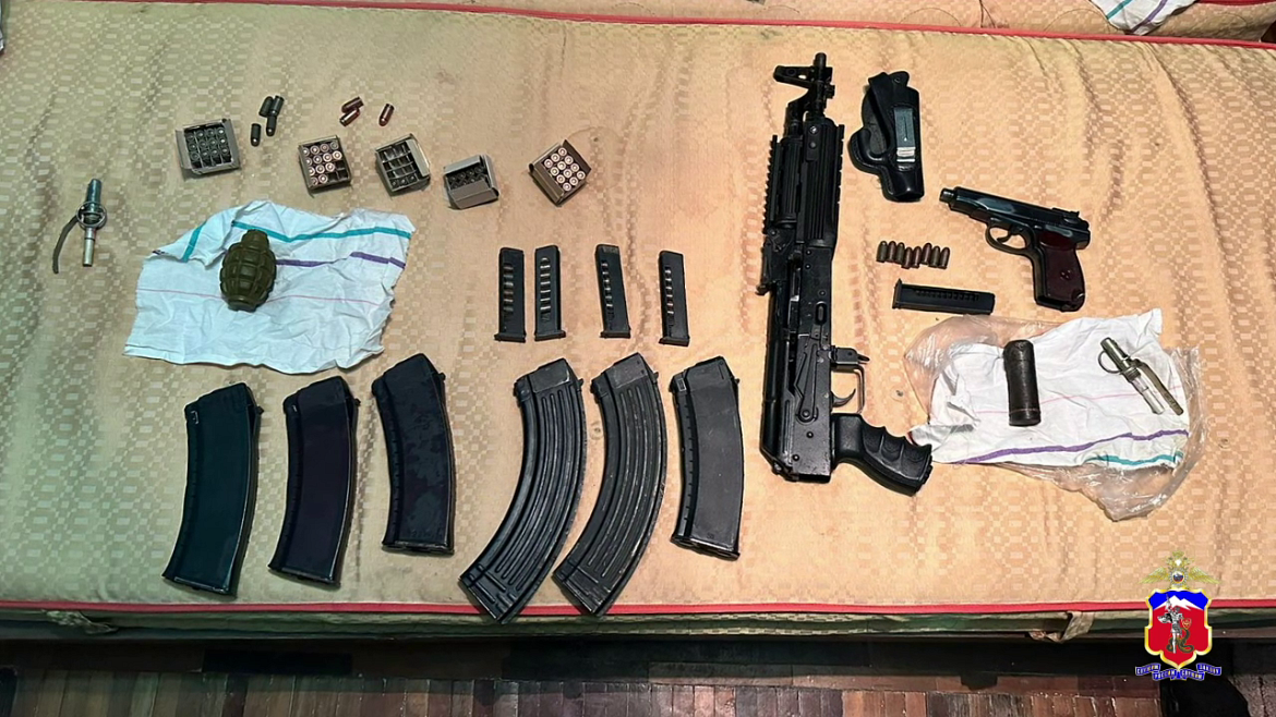 В результате обысковых мероприятий в домовладении задержанного оперативники обнаружили и изъяли арсенал стрелкового и автоматического оружия, в том числе автомат, пистолет, магазины к огнестрельному оружию, патроны различного калибра и взрывные устройства.