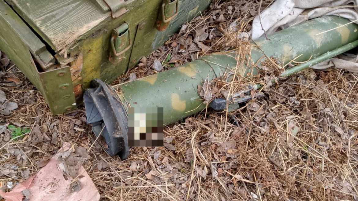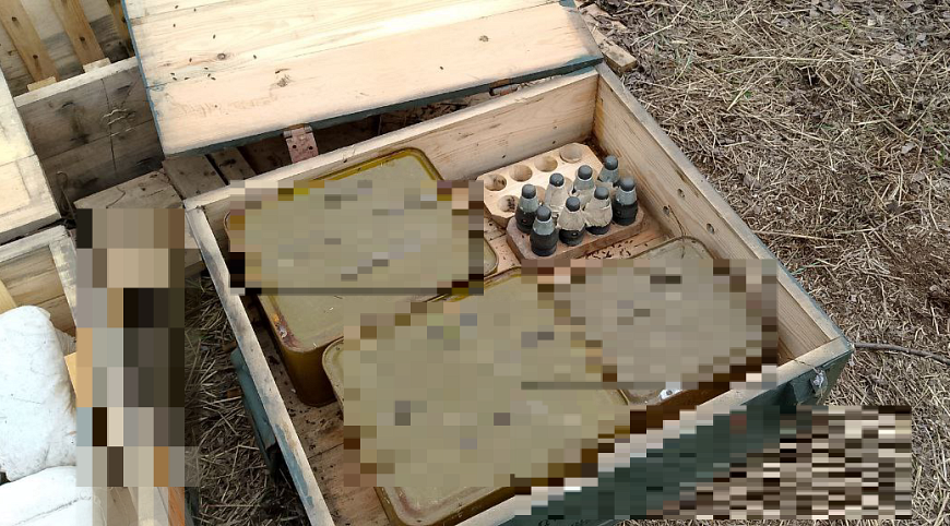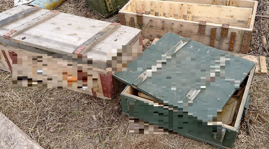 При обследовании участка местности сотрудниками полиции было обнаружено 8 ящиков с артиллерийским порохом общим весом более 250 кг, 44 различных вида электровзрывателей, гранаты и гранатомёт с кумулятивным зарядом.