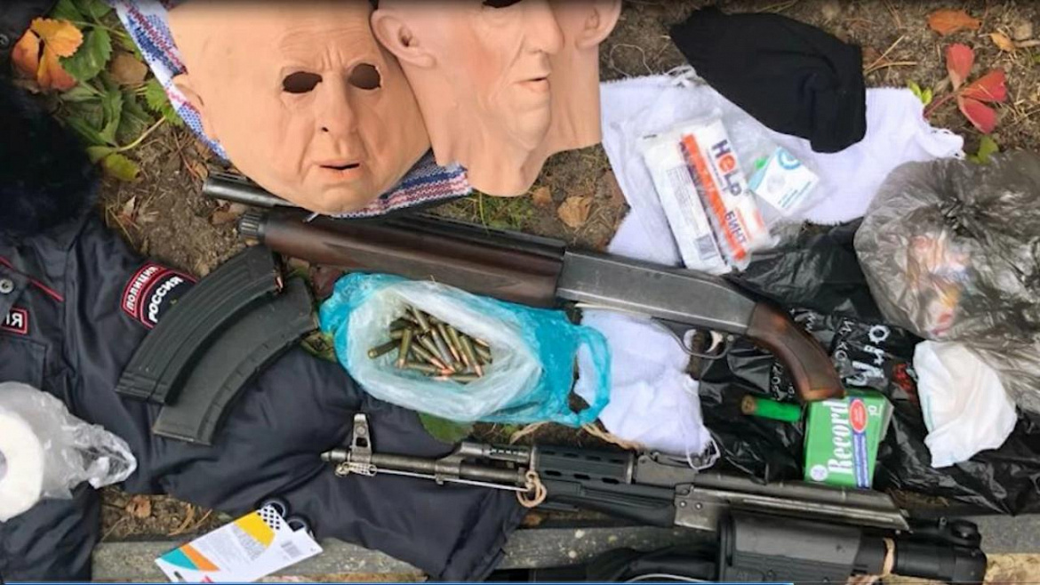 При досмотре в его автомобиле были обнаружены и изъяты обрез гладкоствольного ружья, автомат Калашникова, порядка 200 патронов разного калибра, а также маски, имитирующее лицо человека, форменное обмундирование полиции, 4 сотовых телефона и 10 сим-карт. Помимо этого в багажнике находились подложные номера, которые использовались им с целью конспирации при совершении преступлений.
