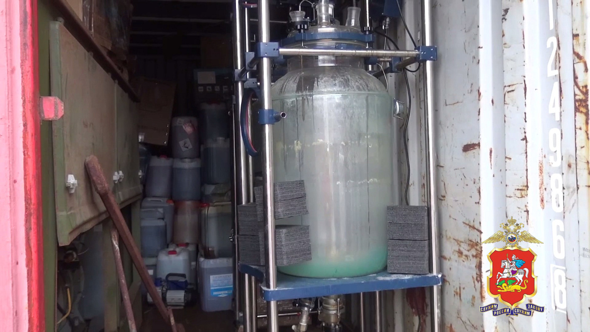 В нём сотрудники полиции обнаружили и изъяли 122 канистры с жидкостью, подносы и стеклянные лотки с остатками вещества, электронные весы, оборудование для синтезирования наркотика, а также 2 свёртка с порошком массой примерно 2 кг. Согласно заключению эксперта ЭКЦ ГУ МВД по Московской области, в одном из изъятых свёртков находился мефедрон.