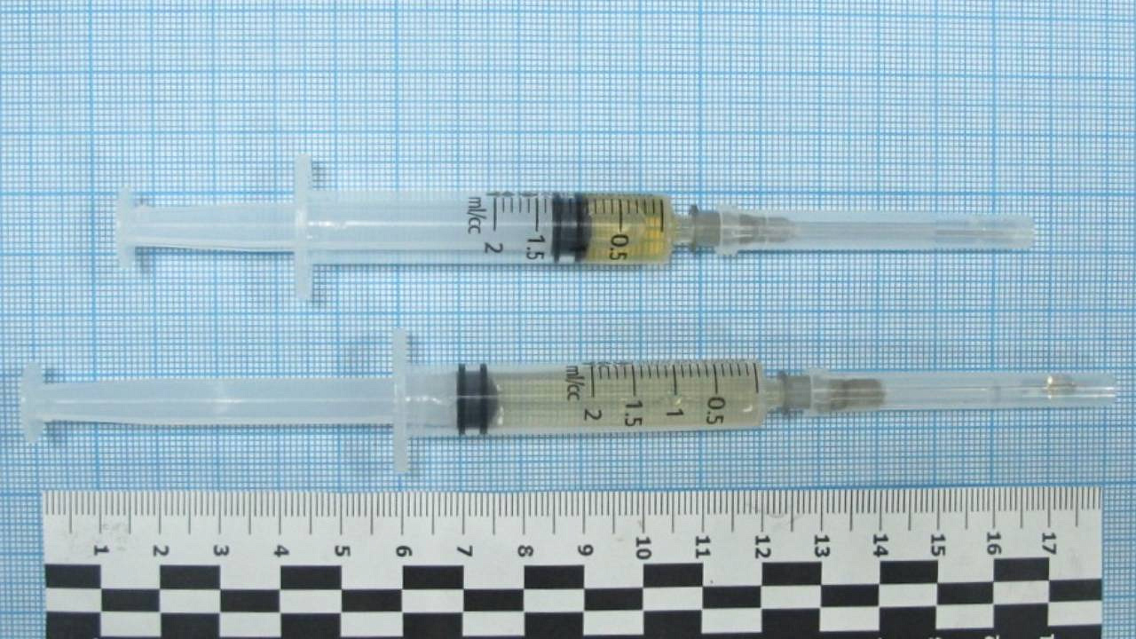 При обыске жилья и личном досмотре задержанных оперативники обнаружили и изъяли у собственника квартиры и его 52-летнего постояльца четыре полимерных медицинских шприца с остатками мутной жидкости. Всего стражи правопорядка нашли более 40 использованных и неиспользованных шприцев и металлическую ёмкость со следами запрещённого вещества. Проведённая экспертиза содержимого показала наличие наркотического средства карфентанила.