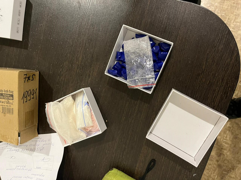 При обыске арендованной подозреваемым квартиры, расположенной на улице Калинина в Красноярске, полицейские нашли в кухонном гарнитуре приспособления для фасовки запрещённых веществ, а также приготовленные к реализации упаковки с неизвестным содержимым. Согласно результатам исследования, обнаруженное является гашишем, мефедроном и синтетическим наркотиком PVP. Общая масса изъятого составляет порядка 1,2 кг.