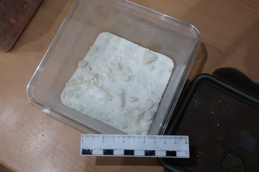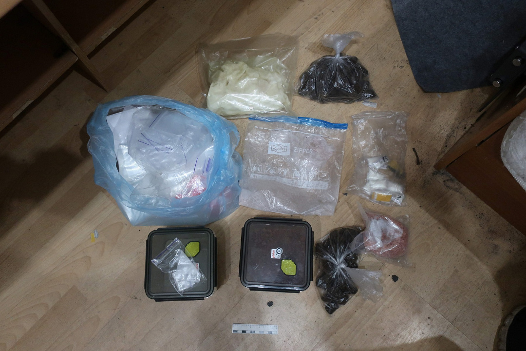 Также в ходе неотложного обыска по месту жительства молодого человека были обнаружены и изъяты два контейнера, три пакета, 23 свёртка и 115 маленьких пакетиков с комплементарной застежкой с разовой дозировкой наркотиков внутри. Согласно экспертизе, изъятые вещества являются смесями, содержащими амфетамин и мефедрон. Их общий вес составил более 1,3 кг.