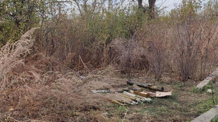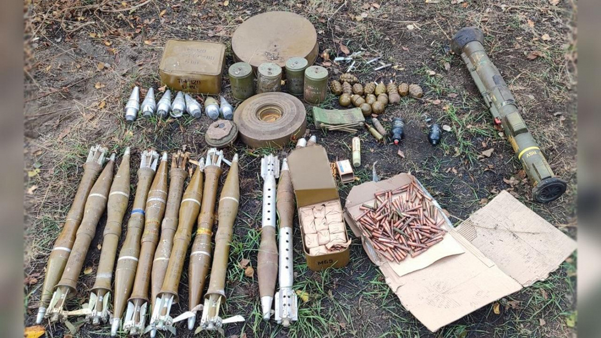 В ходе осмотра стражи правопорядка изъяли из схрона гранатомет иностранного производства АТ-4, осколочные боеприпасы ВОГ-25, ВОГ-17, более 15 ручных гранат (Ф-1, РДГ-1, РГН-2, РГД-5, Терен-6), 9 запалов УЗРГМ, противопехотные мины МОН-200 и МОН-50, более 10 боеприпасов к противотанковым гранатомётам, 12 мин ТМ-120, мины ТМ-62 и ОЗМ-72, а также порядка 600 патронов калибра 9 и 7,62 мм.