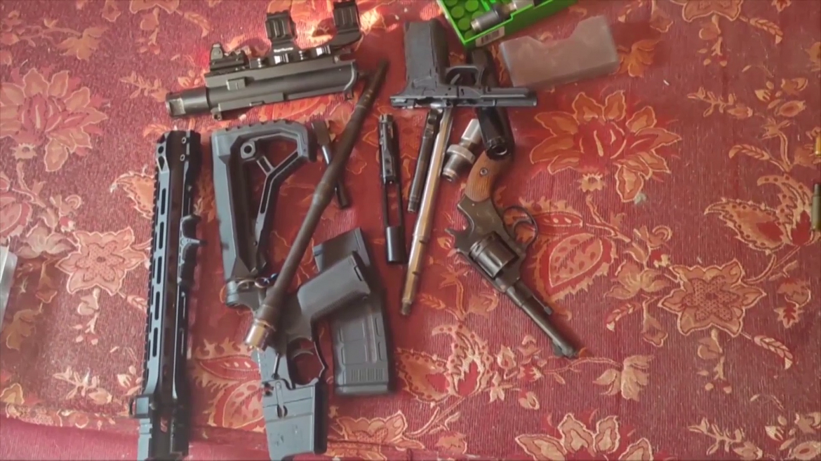 В ходе осмотра квартиры и гаража злоумышленника полицейскими обнаружены и изъяты: две дымовые гранаты, карабин, револьвер с запаянным стволом, коллиматор, более 150 патронов различного калибра, около 100 штук пуль и гильз. Кроме того, изъяты комплектующие для пистолетов и ружей, а также пресс для изготовления оружия и более 2 килограммов пороха.