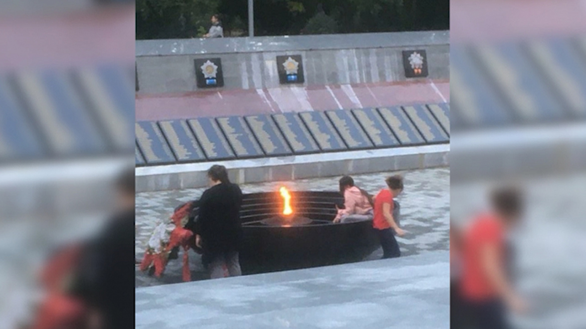 На размещённой в интернете записи видно, что две школьницы сидят в чаше Вечного огня памятника-мемориала воинам-артёмовцам, погибшим в годы Великой Отечественной войны 1941-1945 годов.