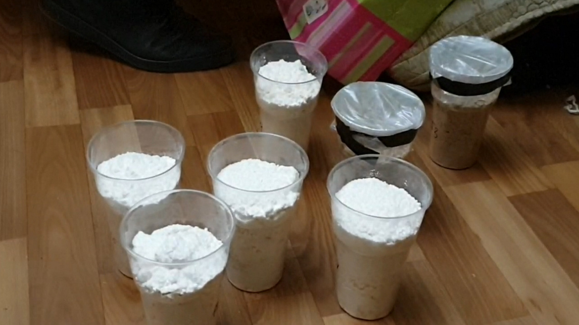 Впоследствии оперативники провели по месту жительства злоумышленника обыск с применением служебной собаки. Полицейский пёс нашёл в жилище три тайника с запрещёнными веществами: в диване, комоде и тумбе. Всего в помещении было обнаружено два полимерных пакета с аналогичным порошком, курительная трубка, в которой так же находился такой же препарат, а также девять пластиковых стаканов с неизвестным содержимым.