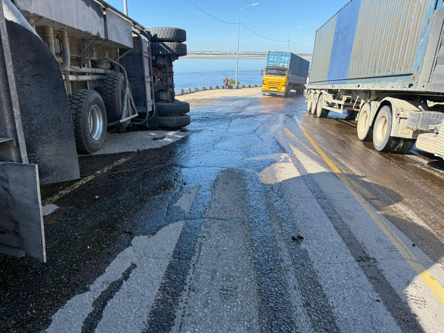 Место происшествия оцеплено, и на данном участке дороги ограничено движение для всех видов транспорта во время откачки топлива из автоцистерны. В результате инцидента работа паромной переправы временно остановлена.