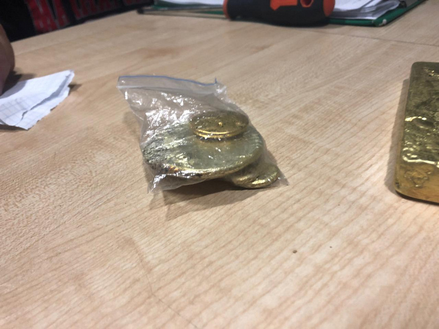 При проведении досмотра транспортного средства полицейскими обнаружены пять слитков жёлтого цвета различных форм и массы.