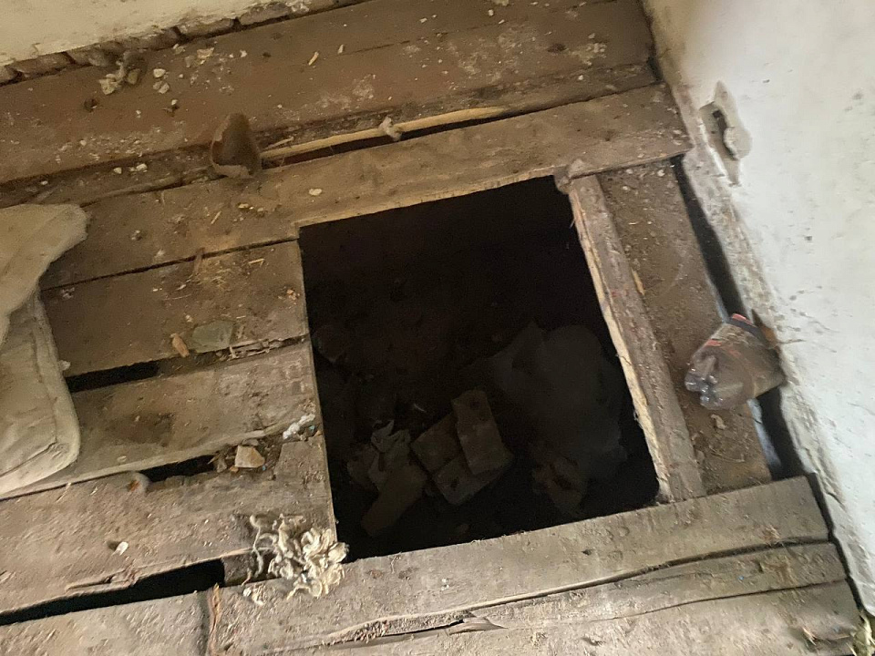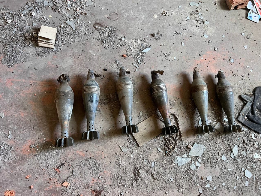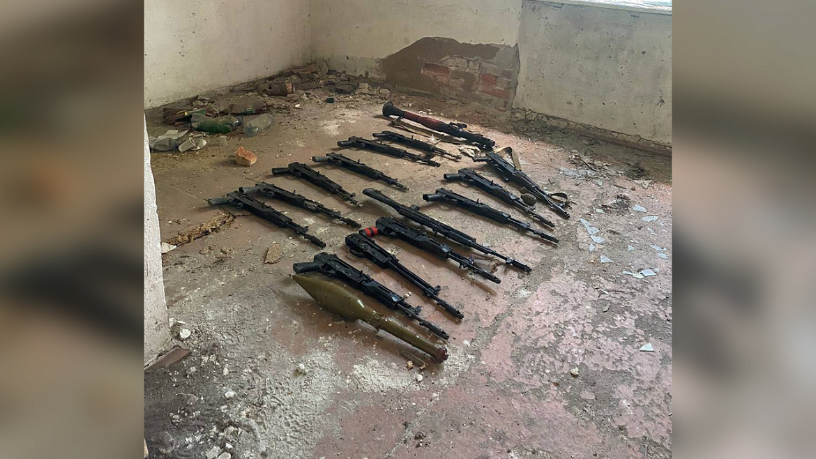 Из схрона в подпольном пространстве правоохранители изъяли 13 автоматов Калашникова разных модификаций, миномётные снаряды, ручные боевые гранаты, гранатомёт и выстрел к нему, а также 350 патронов различного калибра.
