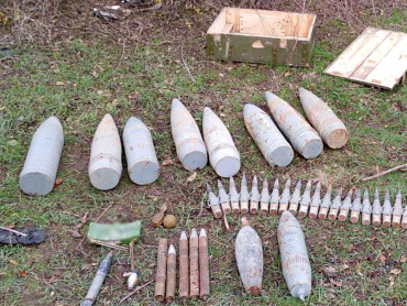 Из тайника изъято 8 артиллерийских снарядов калибра 152 мм, 25 снарядов калибра 23 мм, 120 мм и 122 мм, 2 гранаты Ф-1 и РГО-1, а также противотанковая мина МОН-50.