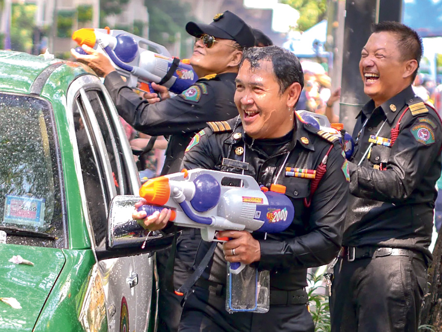 Жители жаркого Таиланда получают от правоохранителей по-особенному оригинальные поздравления на Новый год. Торжество там именуется Сонграном, что на санскрите означает «переход» («санкранта») и символизирует смену времён года. Праздник отмечают в середине апреля – перед сезоном дождей. По одной из традиций тайцы поливают водой или жидкой глиной статуи Будды, а также повсеместно обрызгивают друг друга. Считается, что таким образом можно призвать обильные осадки во время сезона выращивания риса, получив в итоге богатый урожай и прибыльную торговлю. Кроме того, люди верят, что вода очищает от негатива, накопленного за прошедший год.