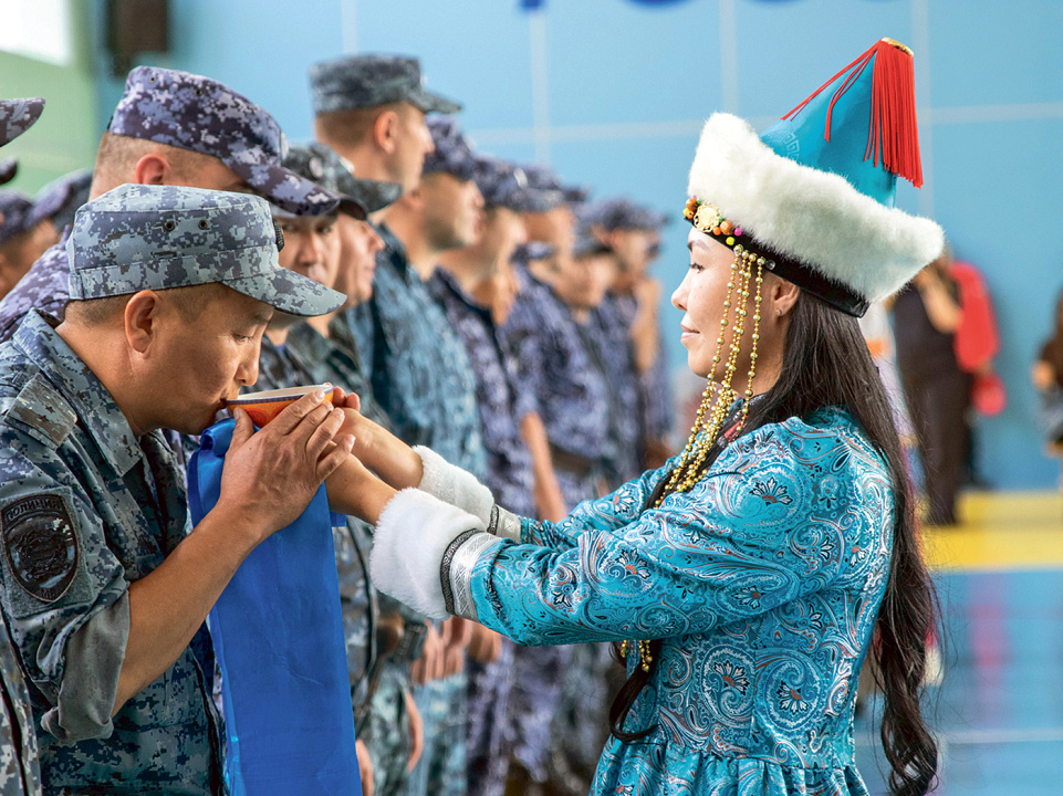 Вторая девушка, наряженная в дэгэл – бурятский национальный костюм, держит в руках голубой хадак – ритуальный шарф, у буддистов олицетворяющий гостеприимство, вечное небо, гармонию, согласие и спокойствие. На нём молоко в пиале – символ достатка и чистых помыслов. Напиток дают пригубить бойцам отряда, сопровождая ритуал добрыми пожеланиями в адрес каждого из них.