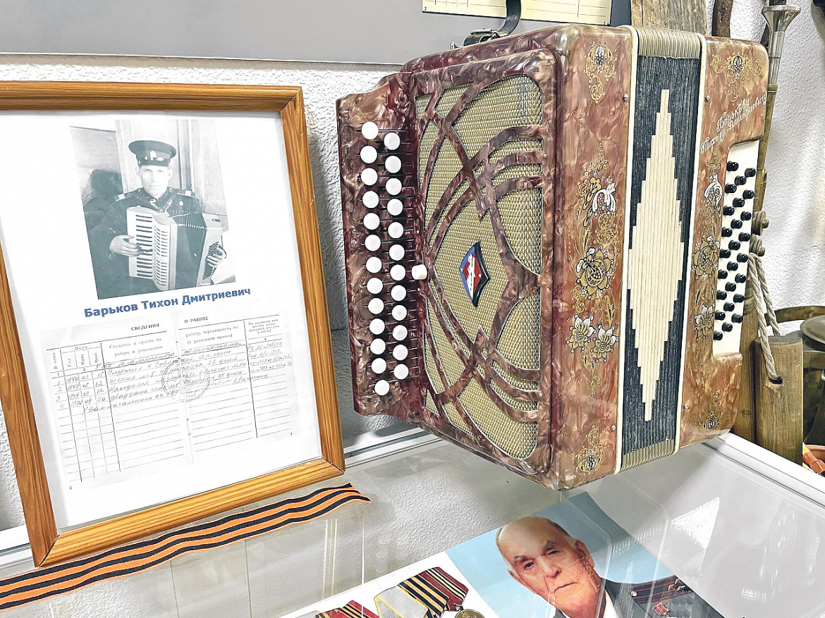 Восемь лет назад под стеклянной витриной появился музыкальный инструмент знаменитой фабрики «Шуйская гармонь». Он соседствует с наградами своего единственного владельца - Барькова Тихона Дмитриевича.