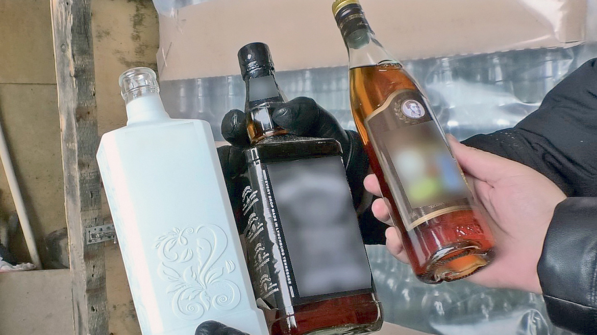 В общей сложности сотрудники транспортной полиции и УФСБ провели оперативно-разыскные мероприятия в шести помещениях, расположенных в разных районах областного центра. В первом же гаражном боксе недалеко от железнодорожного вокзала сыщики увидели весьма неприглядную картину. Просторное помещение, как сцену в театре абсурда, по периметру закрывал синий полиэтиленовый занавес. Отодвинув его, оперативники обнаружили огромную пластиковую ёмкость, возвышавшуюся на деревянных палетах. От неё отходили шланги: в этом гигантском резервуаре смешивали спирт с водой и разливали полученную смесь по бутылкам. Затем на тару наклеивали этикетки различных торговых марок, навинчивали крышки и упаковывали готовую «водку» и прочий «элитный» алкоголь в коробки, штабеля которых занимали всё видимое пространство. Производство контрафакта осуществлялось в антисанитарных условиях: грязный пол, облезлые заплесневелые стены, повсюду банки с окурками. В крошечной подсобке, отделённой от основного помещения тонкой перегородкой, работники подпольного цеха, вероятно, делали передышку от «праведных» трудов. На батарее выстроился для просушки десяток пар мужской обуви разного размера, и тут же стояли пластиковые ёмкости с красителями и ароматизаторами, которые добавляли в спирт для создания «виски» и «коньяков».