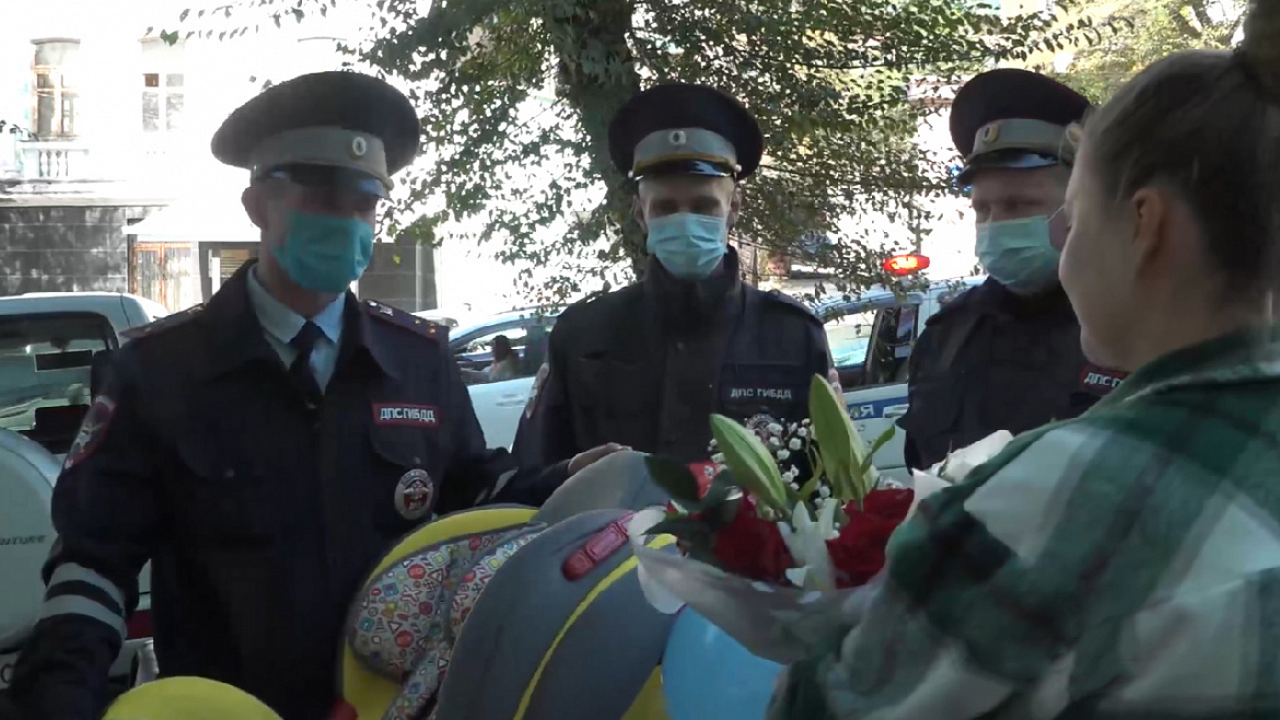 Через несколько дней полицейские приехали на выписку матери и её новорождённой дочки. Около роддома они от всей души поздравили счастливых родителей и вручили подарок от Госавтоинспекции города Владивостока - детское автомобильное кресло.