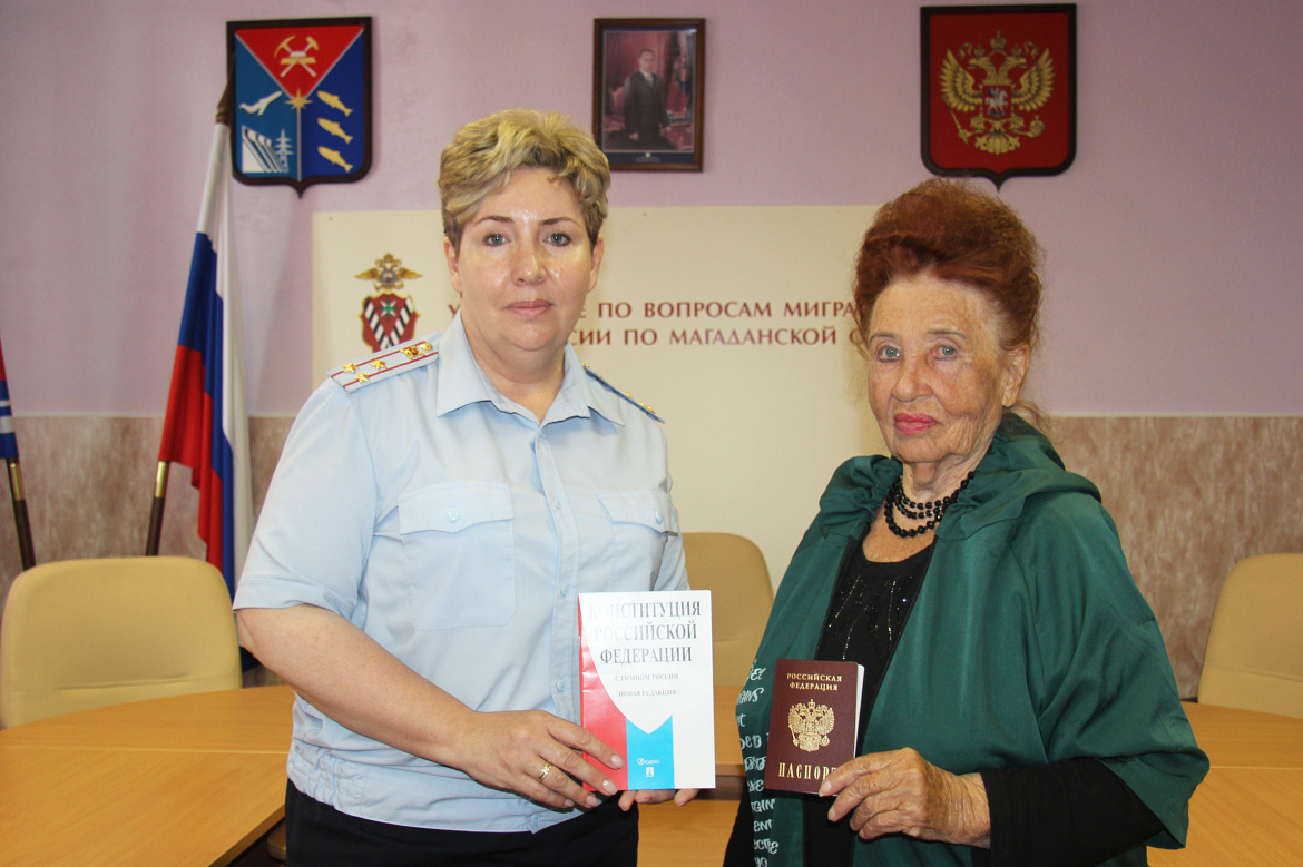 Начальник Управления по вопросам миграции УМВД России по Магаданской области полковник полиции Лионелла Головина в торжественной обстановке вручила уроженке Луганской Народной Республики паспорт гражданина Российской Федерации. Женщина воспользовалась упрощённой процедурой получения гражданства России.