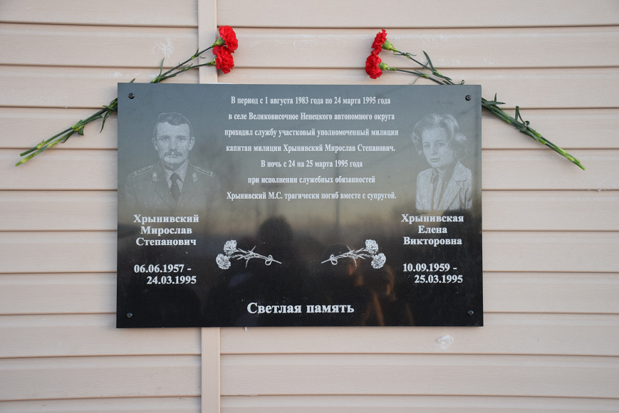 В преддверии празднования Дня участковых уполномоченных полиции в селе Великовисочное Ненецкого автономного округа на здании администрации сельсовета установлена мемориальная доска в память о погибших участковом уполномоченном милиции капитане милиции Мирославе Степановиче Хрынивском и его супруге Елене Викторовне Хрынивской.