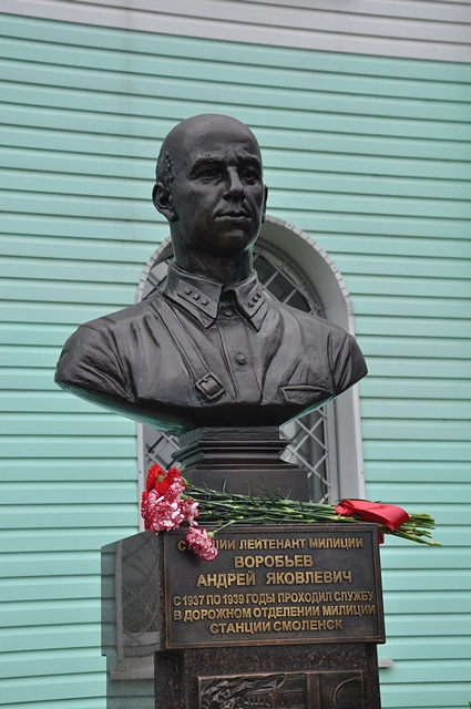 В Смоленске состоялось открытие памятника герою Великой Отечественной войны старшему лейтенанту милиции Андрею Воробьеву, который в июне 1941 года возглавлял защиту железнодорожного вокзала в Бресте.