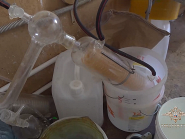 Полицейские изъяли из лаборатории различное оборудование, шесть ведер с 32 кг мефедрона и 900 л прекурсоров, более 250 кг порошкообразного вещества и неустановленной жидкости.
